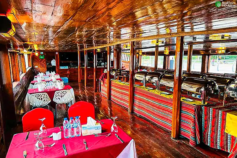 As the dhow sails along the marina and the tranquil waters of the Arabian Gulf, you will enjoy panoramic views of Dubai’s illuminated skyline. The vessel seamlessly blends traditional wooden craftsmanship with modern comforts, offering spacious open decks and elegant indoor lounges.