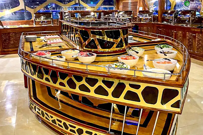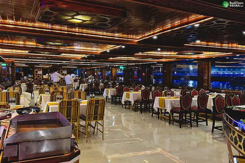 A VIP deck is available, which is a reserved section. It mainly includes bottle service with regular facilities. As the cruise sails through the tranquil Arabian Gulf, the serene and enigmatic views of the city look marvelous. Furthermore, guests can dance to the energetic live DJ. The cruise covers the iconic landmarks of Dubai- Burj Al Arab, JBR, Atlantis, and Palm Jumeirah.