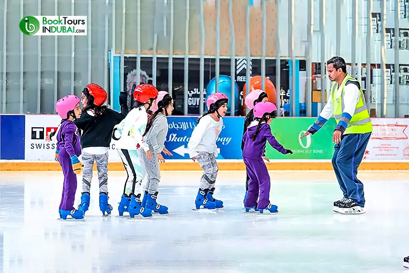 • It’s ideal for kids to start learning skating from the age of three. Children who are under 100cms should be accompanied by an adult all along the time spent at Ice Rink. Kids are given complimentary helmets so that they stay safe.